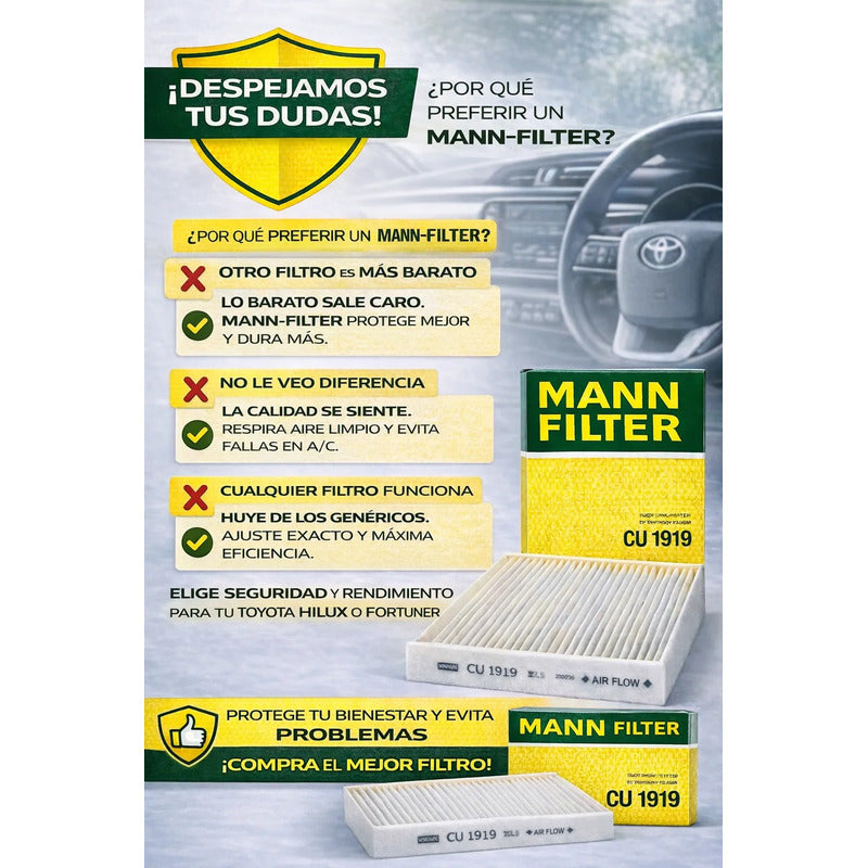 El filtro de aire acondicionado MANN-FILTER para Toyota Hilux y Fortuner está diseñado para garantizar un aire más limpio y saludable dentro de la cabina, reteniendo polvo fino, polen y partículas contaminantes. Un filtro en buen estado mejora notablemente el confort de conducción y protege a los ocupantes, especialmente en trayectos largos o en zonas con alta contaminación y polvo. MANN-FILTER es una marca de origen alemán reconocida a nivel mundial, utilizada por fabricantes y talleres especializados por su calidad OEM, ajuste exacto y alta eficiencia de filtración. Sus materiales premium permiten un flujo de aire óptimo sin forzar el sistema de aire acondicionado, ayudando a prolongar la vida útil del ventilador y del evaporador, y evitando olores desagradables en la cabina. No dejes pasar más tiempo para renovar el aire que respiras en tu vehículo. Cambiar el filtro de cabina a tiempo mejora el confort, protege el sistema de A/C y cuida a quienes viajan contigo. Consulta ahora disponibilidad y asegura el filtro correcto para tu Toyota Hilux o Fortuner con una marca en la que puedes confiar.